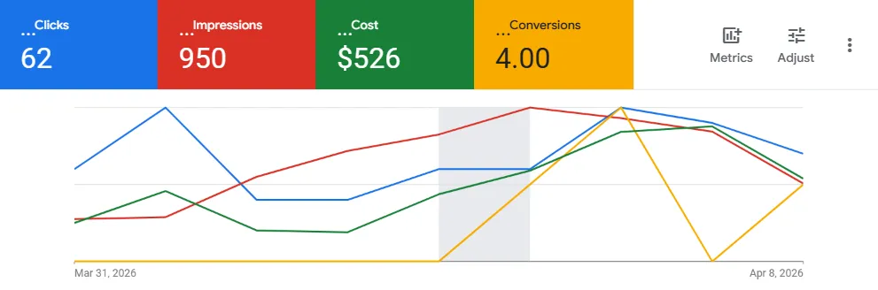 Uriel runs a landscaping operation in Tucson. Before working with us, estimates were sporadic — no steady pipeline, no paid ads, just hoping the phone would ring. We launched a Google Ads campaign from scratch and kept the budget lean. With a smaller spend, the learning phase took a little longer than usual to work through — but once the algorithm found its footing, leads started coming in. In just one week: 4 conversions, 62 clicks, and a cost per lead of $131. Now Uriel knows where his next job is coming from.
